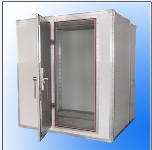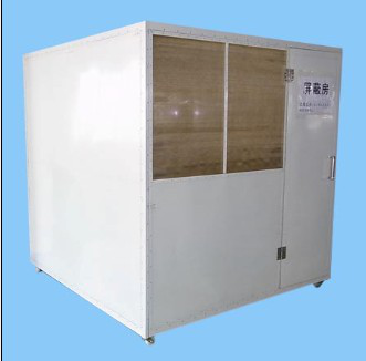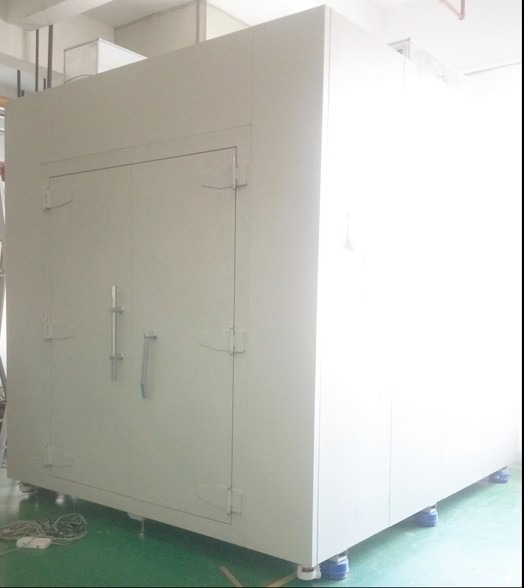 用25*25*1.0和25*50*1.0鍍鋅扁通焊接成框架形狀,四周用0.5MM厚鍍鋅板密封,門采用方通及鍍鋅板作雙層框架,配進口鈹銅彈片包四周,以增加碰觸面及屏蔽效果,門側上半部分別為8層屏蔽網,表面一層為鐵網,內部為銅網,以免碰穿,起到保護作用,同時網的部份也可以用來做透視窗,銅網與鍍鋅板拼裝;屏蔽房頂部安裝30*30金鈴排氣扇;地面用1.5cm厚夾板作地板,貼12"*12"*1.2MM阻燃地板膠。屏蔽房底部安裝可移動輪子,帶剎車;安裝方便,可移動,可拆遷,雙層結構